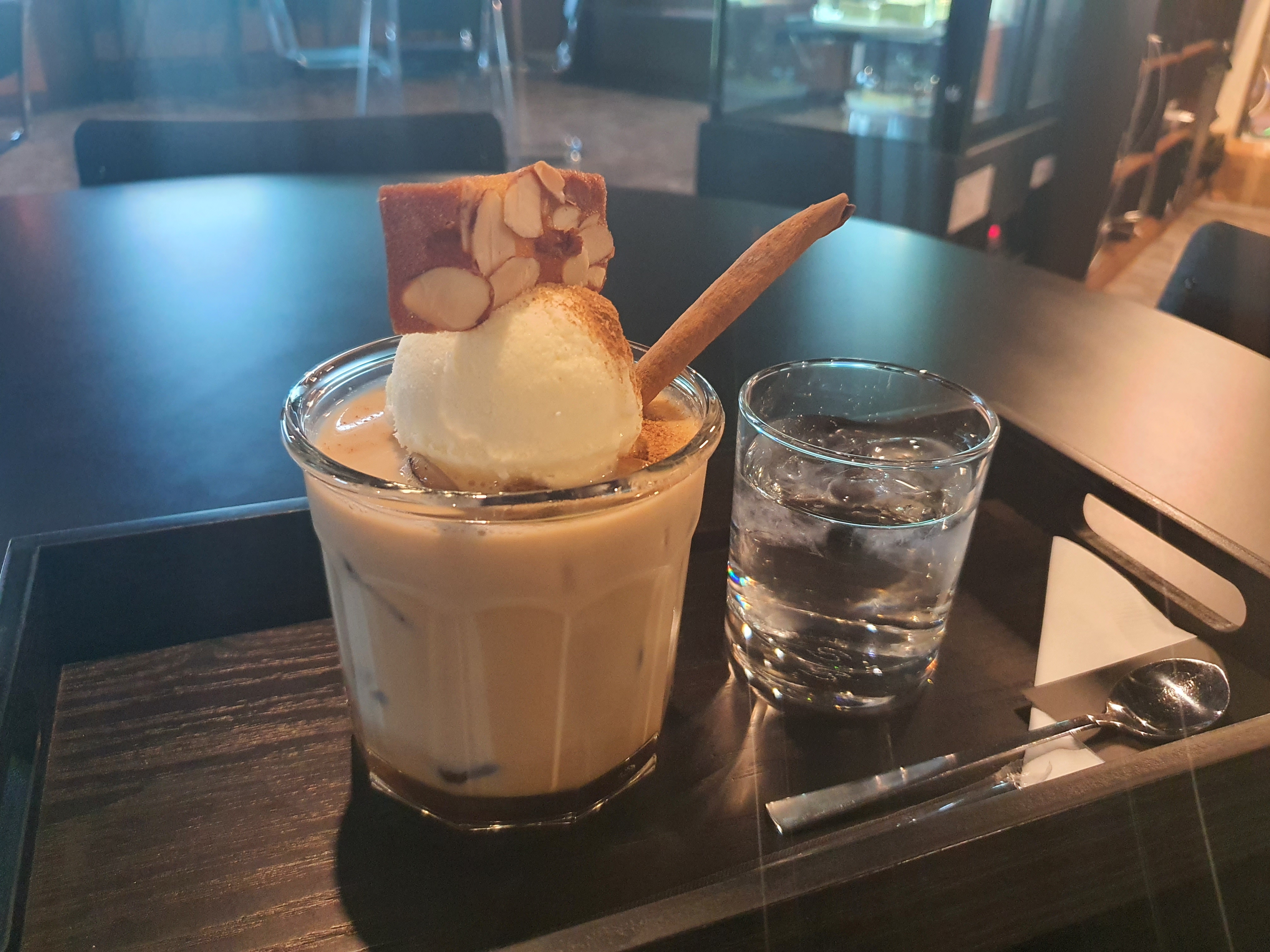 위에 올려진 튀각을 아이스크림, 커피와 곁들여 먹고
